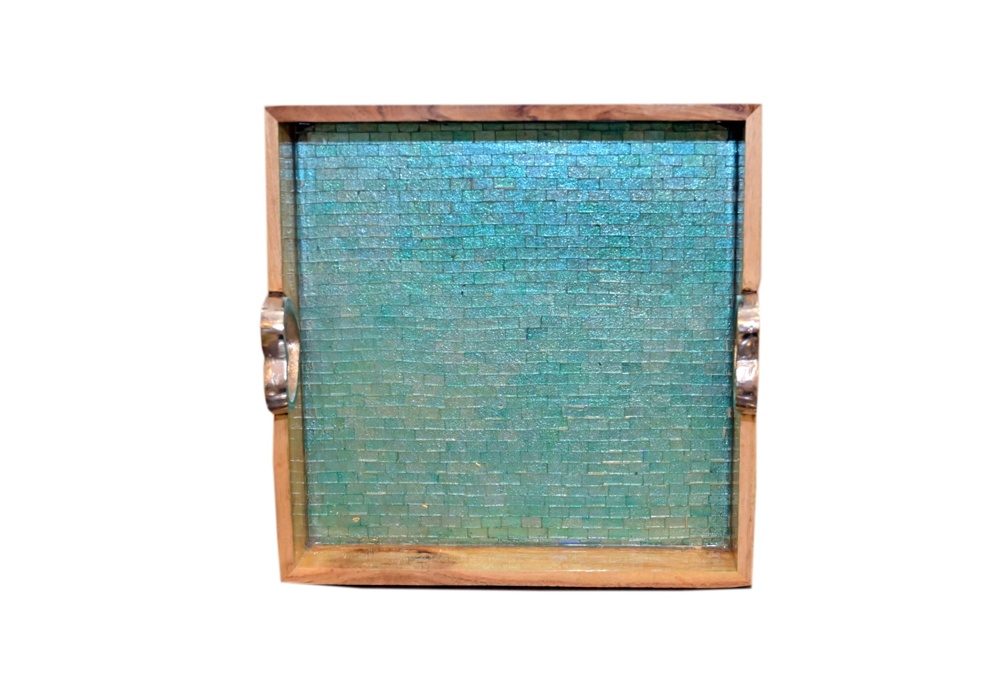POSH-DIKUR Turquoise Coloured Wooden Tray with Metal Handles